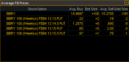 Entry comments: It's a 5x7x2 butterfly; strikes at 15/14.5/13 Closed 100 shs BBRY for 0.28 and rotated capital in my tiny account. BOT 5 15 PUTS when the stock broke 14.80 then sold 5 14.5s against them. Shorted 2 14.5/13 PUT verticals against the spread. Looking for $1 profit.