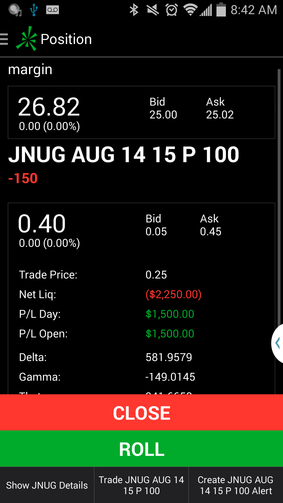 Entry comments: Symbol JNUG / Selling -150 August 2014 Contracts / Strike price $15.00 / Bid Limit or better $0.20 / Buying Power used $24,750 / Profit Goal $1,500.00 or 50% of total profit / Probability of success is 79%