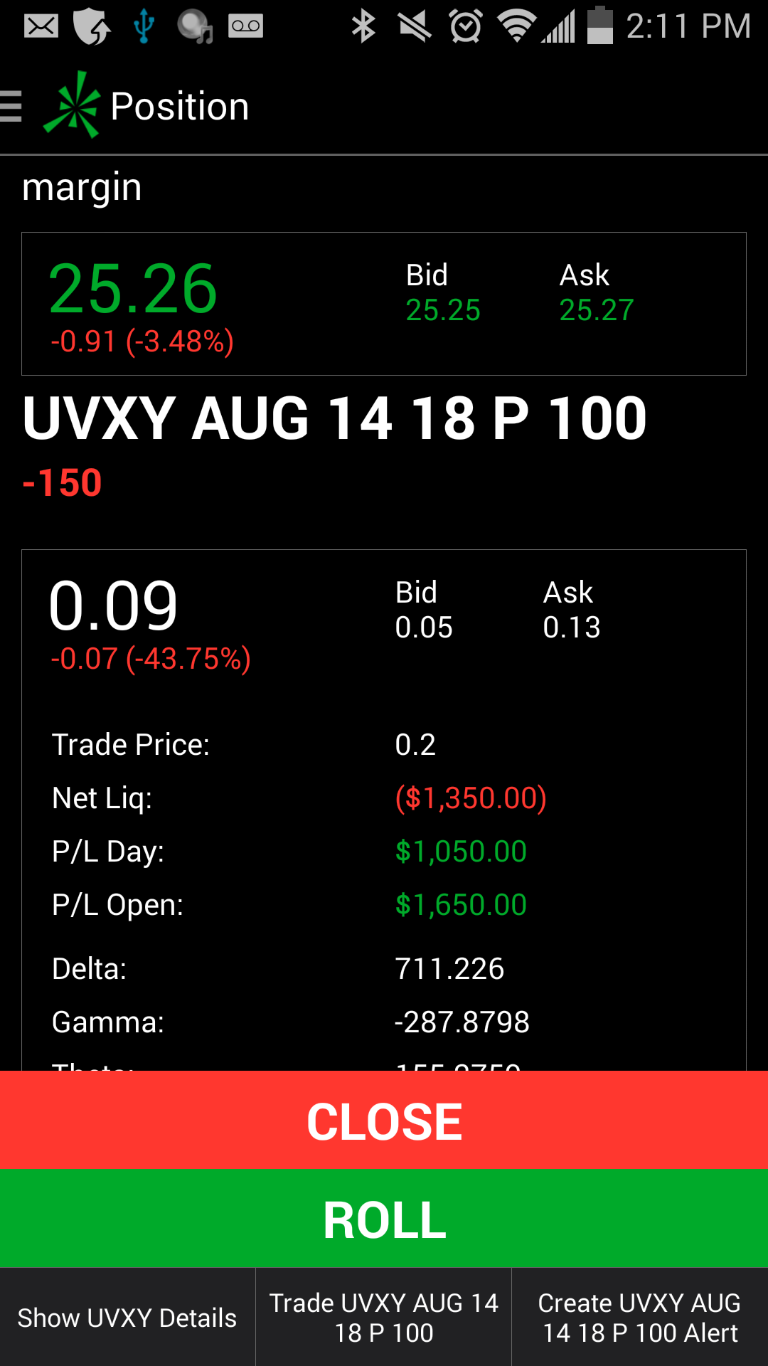 Entry comments: Symbol UVXY / Selling -150 August 2014 Contracts / Strike price $18.00 / Bid Limit or better $0.19 / Buying Power used $28,200 / Profit Goal $1,425.00 or 50% of total profit / Probability of success is 86%