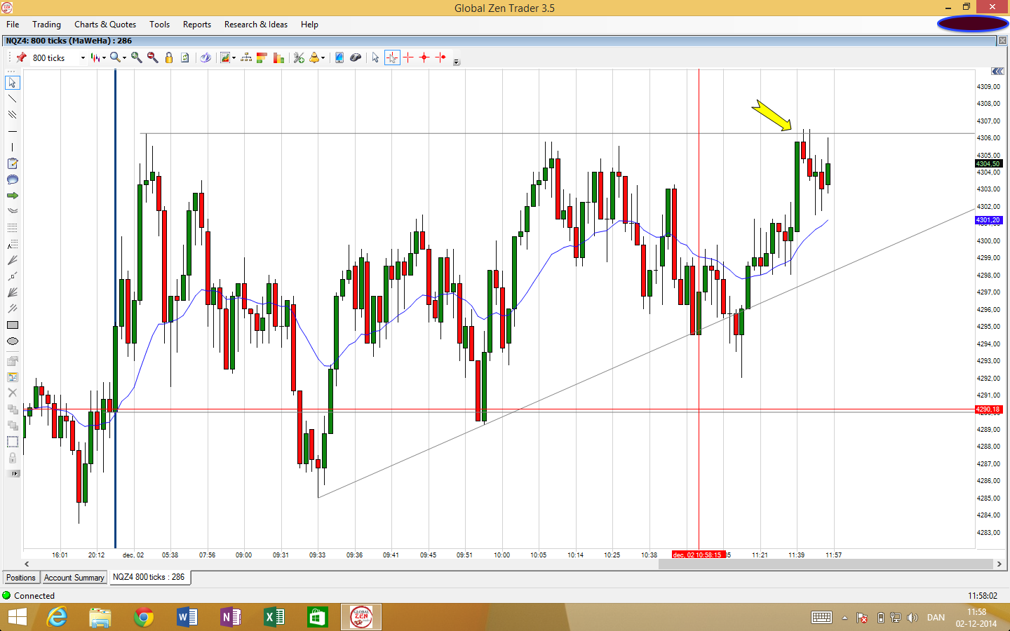 2 ticks from target, so I moved my stop to point of entry which resulted in a breakeven.
