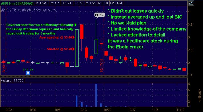 I foolishly made this trade post-surgery when my mind wasn't fully on. And its because of my two previous lucky trades where I broke my rules yet still made money shorting $SCOK and $SINO that I decided to average up and not cut my losses quickly! At least I waited to short this one into the afternoon fade but it had a Friday afternoon squeeze. Add that to the fact that I didn't pay attention to the sector (healthcare was running wild) and here you have my greatest lesson for the year.