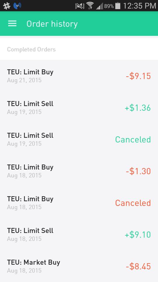 Second no commission trade with Robinhood.io. I know this stock is trending down, so but I know along the way the stock is fluctuating hard, so what I do is take the trade as low as I can, and as soon as I get shares, I put a limit order in for a little bit higher, generally no more than half way to the last peak.