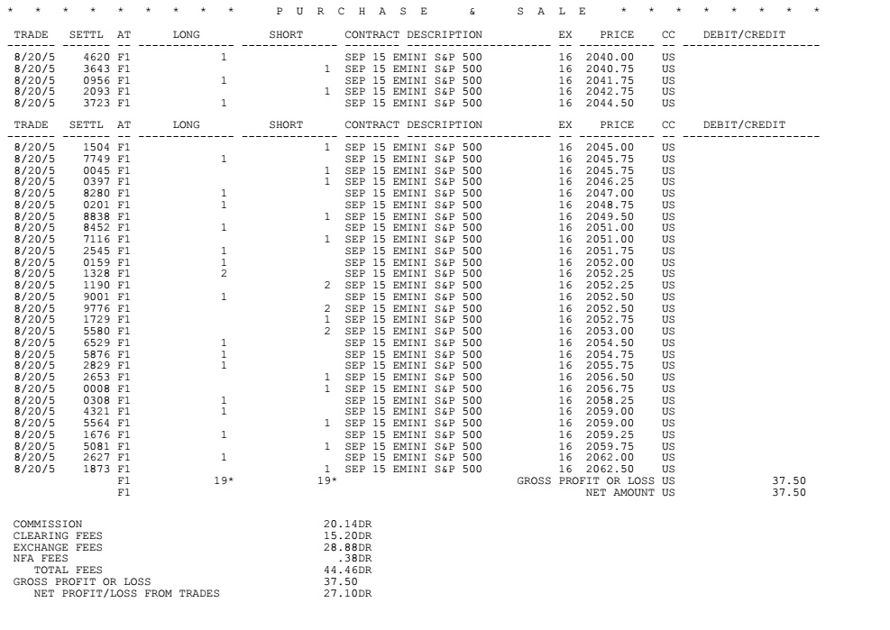 Multiple short and long ESU5 trades on 08/20/2015. Ended the trades in the positive but commissions and exchange fees dragged me under.