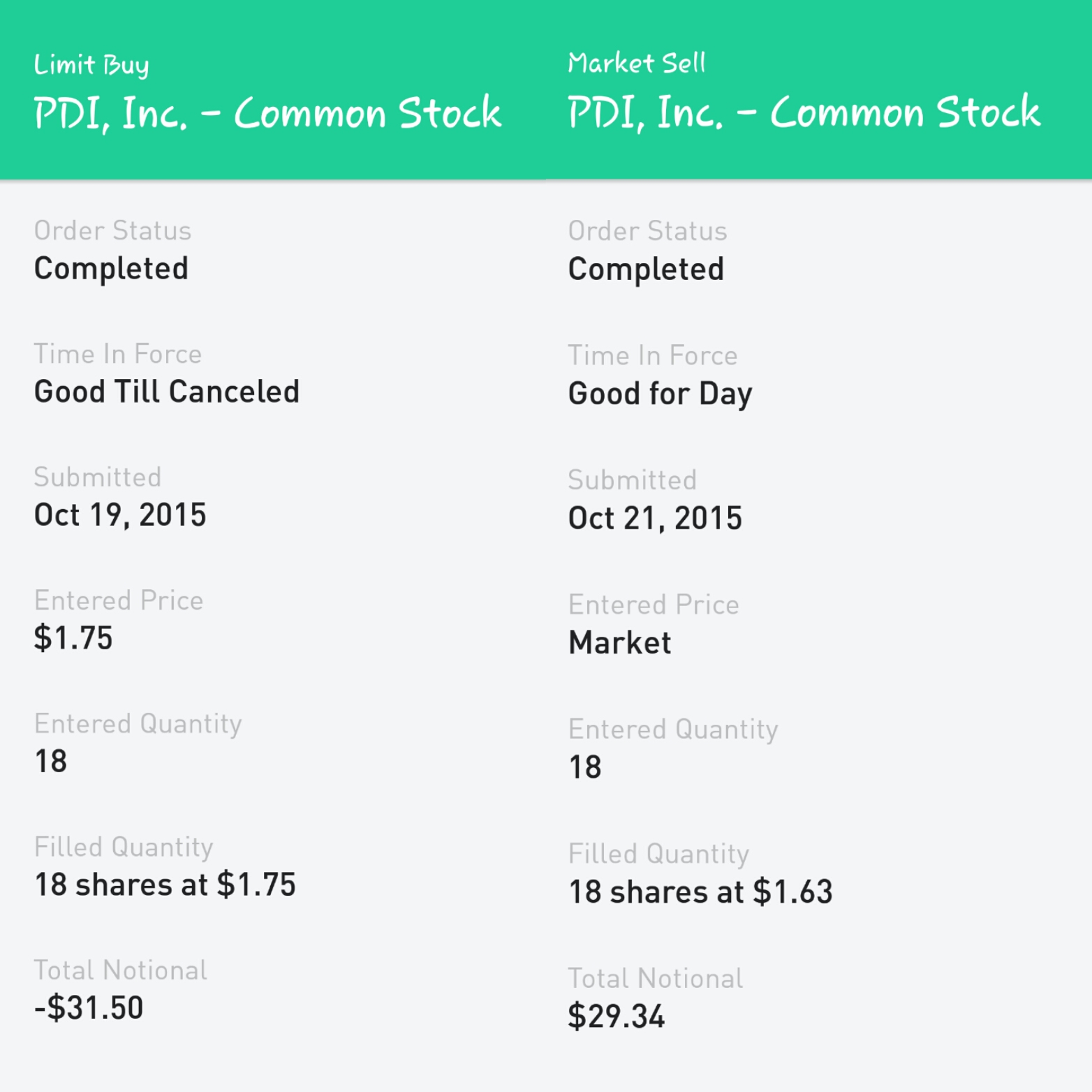 This one had "wrong" all over it. I chased, and chased, and chased again. When I got in at $1.75 after the dip on 10/19, it went to $1.93 and I missed a sell order by being too greedy. So, it crashed after and hung out low for a couple days. I finally got rid of it at $1.63 after an increase today on some news. So, no more chasing when I know I shouldn't, and accept a smaller gain if I have to. The positives: lessons learned on almost no money risked, and the price rose for an easy loss.