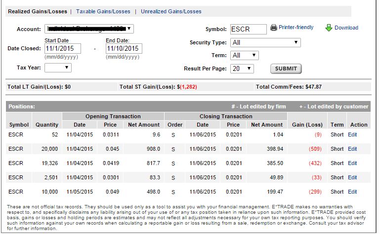 Took a major gamble and it completely bit me in the ass. Went long 11/4 and 11/5 and AH 11/5 the company announced bankruptcy. Had to call in my order on 11/6 and have someone at Etrade execute it since they freezed trading on it since a Q was being added to the ticker. I remember being on hold with Etrade as the PPS plummeted. THE WORST FEELING EVER! I was shaking, thinking I could lose a shit ton of money. Luckily I got out with a little less then half of my money. No more pink sheets for me!
