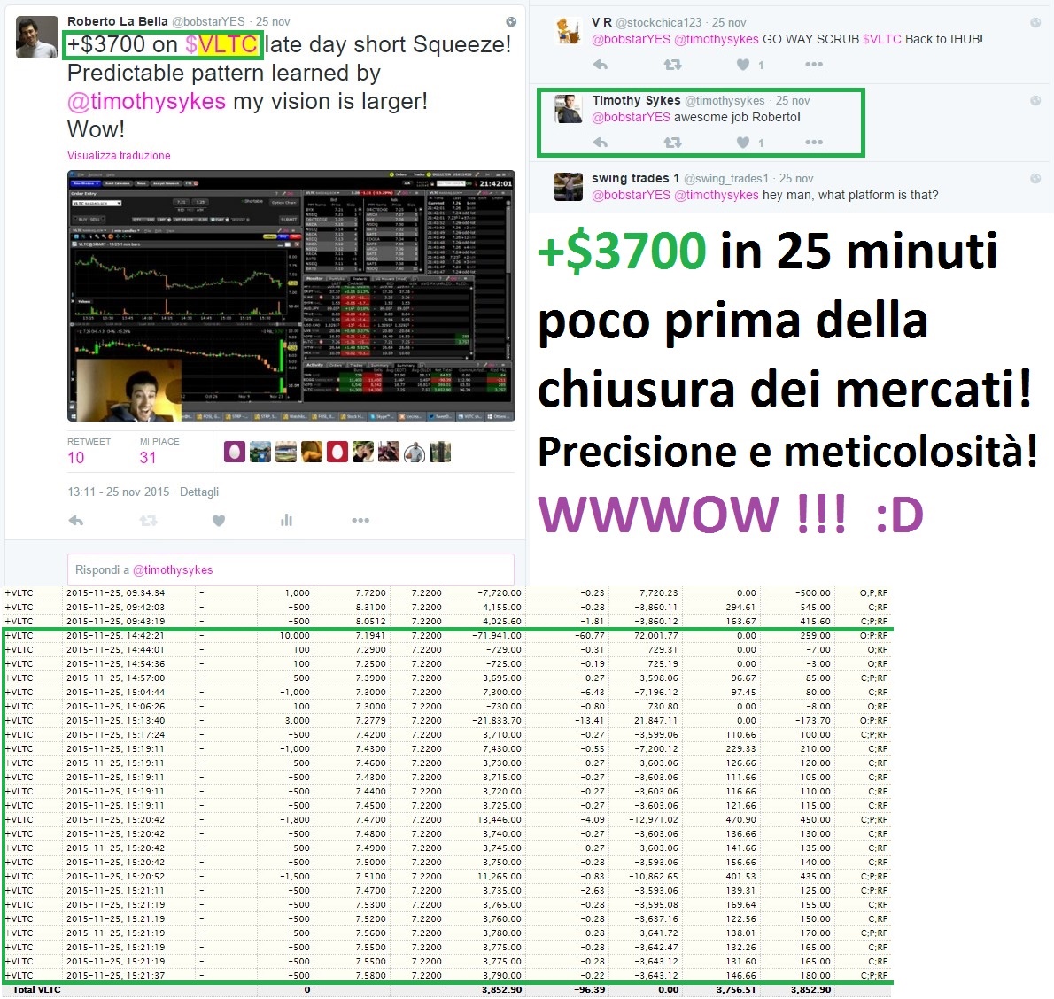 Wonderful trade long on VLTC! It's a clear application of the Strategy on a late day Squeeze, on this momentum stock! ******************************************************************* I received also the Congratulations from Tim Sykes on Twitter! *******************************************************************