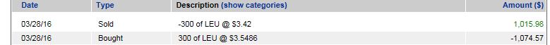 Stupid loss. the second I bought the stock it dropped to my mental stop loss. I tried selling but I typed in the wrong ticker to sell. since I was watching SUNE today I tried selling SUNE instead of my LEU. I guess subconsciously I wanted to be in SUNE since that was the better play as it turns out.