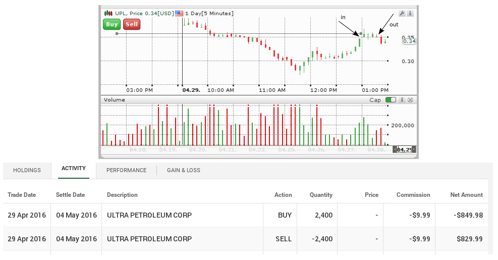 Saw bullish move with volume, took 2400 shares at .35 seeing as it was reaching a resistance point from earlier today. Thought could breakout and make a few cents a share. Ultimately momentum died out and decided to break even with trade fee loss. Trying to teach myself, trade fees are ok to lose when you are testing a price/direction doesnt go your way. This trade was a monetary loss, but confidence gainer because I have been struggling all week pulling the trigger and holding to game plan.