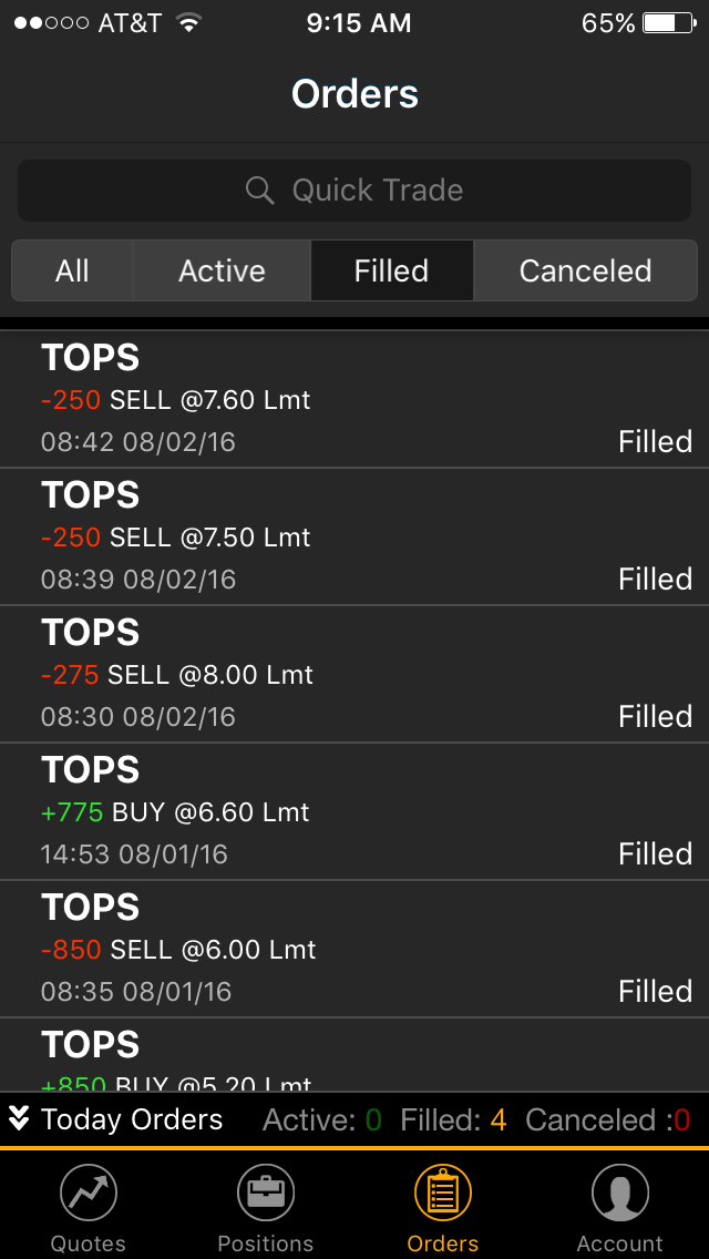 After the morning spike and profit on 8/1/16 $TOPS showed strength all day. Held key support levels toward the end of day. I bought into 5 minutes to market close to hold O/N. It spiked premarket and a little more at the open.I sold some at $8.00 on the way to the top of $8.30. Then it dropped to support around $7.30. it fought back to $7.50 where I sold more thinking it was a dip to new highs and then sold the rest at $7.60 when the stock didn't feel to have the strengthen need for a nhod.