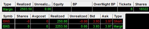 P/L: Wire issues so still was on SpeedTrader account,only was able to trade with $20K but managed good profits $ISNS