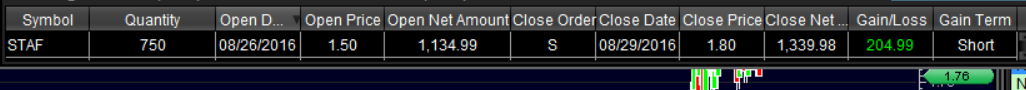 Heard about the hype for Staffing 360 Solutions and their earnings so I bought into market close on Friday 8/26 and sold into the morning frenzy Today (Monday 8/29).