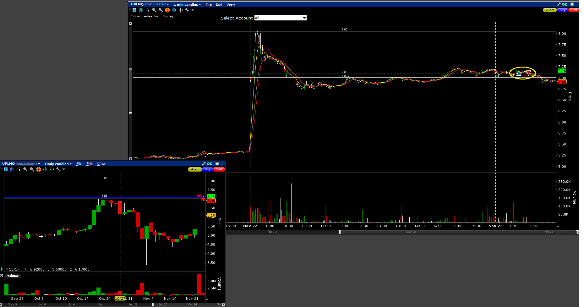Bought in the morning because stock was helding multi-day support @ $7.00 and i was buying in anticipation of a breakout above $7.25 which could trigger a spike towards $8.00. Unfortunatelly stock made another top (lower high) so i cut my loss because i was scared that it could go from green to red which could trigger a fast panic and i would not have any chance of cutting my loss fast.