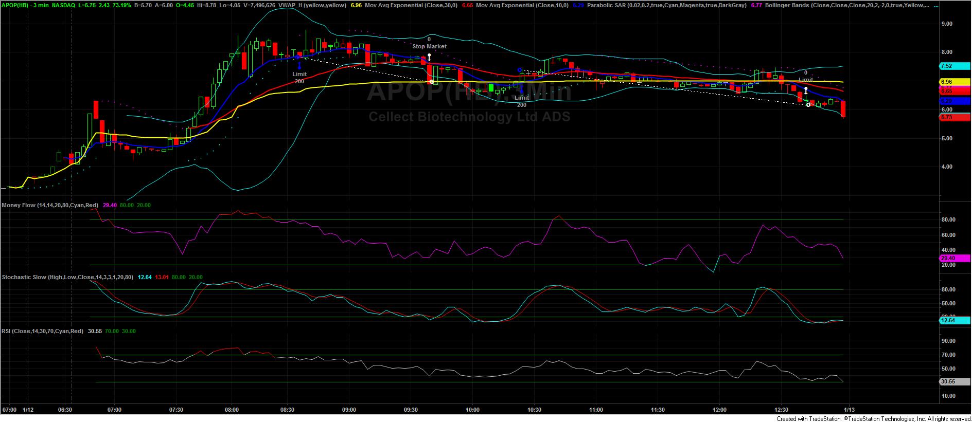Here was another parabolic mover. Could not find any news on it. Decided to go long once price pulled back to the 10 EMA. Condintued to ride it out with small pops here and there (no pun intended) but eventually got stopped out - twice!! Always cut your losses when you're wrong. (see chart)
