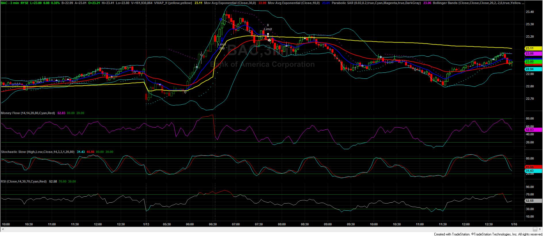 All bank stocks were playing to the upside today due to earnings. Decided to go long on this stock and it basically reversed as soon as I went long. Once the stock went below the VWAP and we had a 10/30 ema cross I got out and cut losses. (See chart)