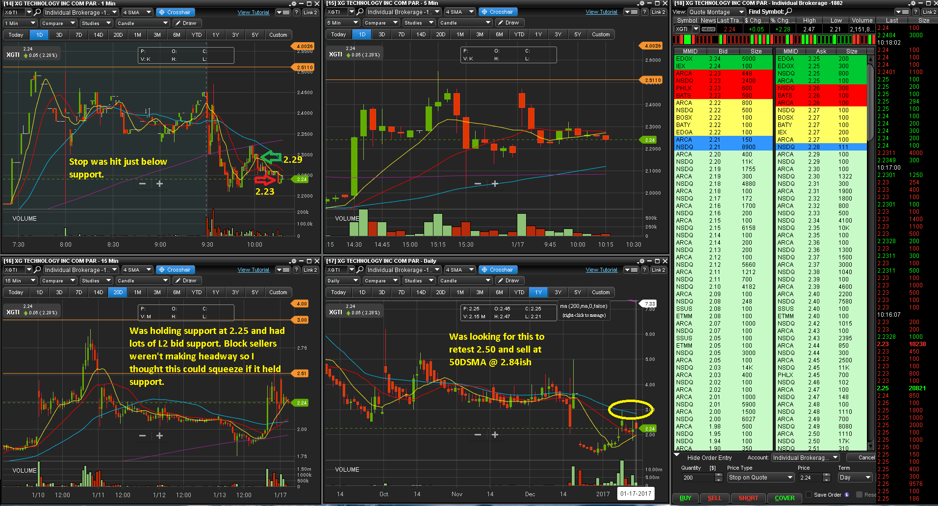 Had news over the past week including PM news today. Seemed to be holding intraday support and L2 bids were strong. Earlier Block sells led me to believe this could squeeze if support continued to hold. Markets were down at the open but seemed to be recovering. Stop loss set to 2.24 just below the support and big bids of 2.25. Stop was hit. The dip buy was low risk per se but the volume for recovery wasn't there. I have poor history targeting short squeezes