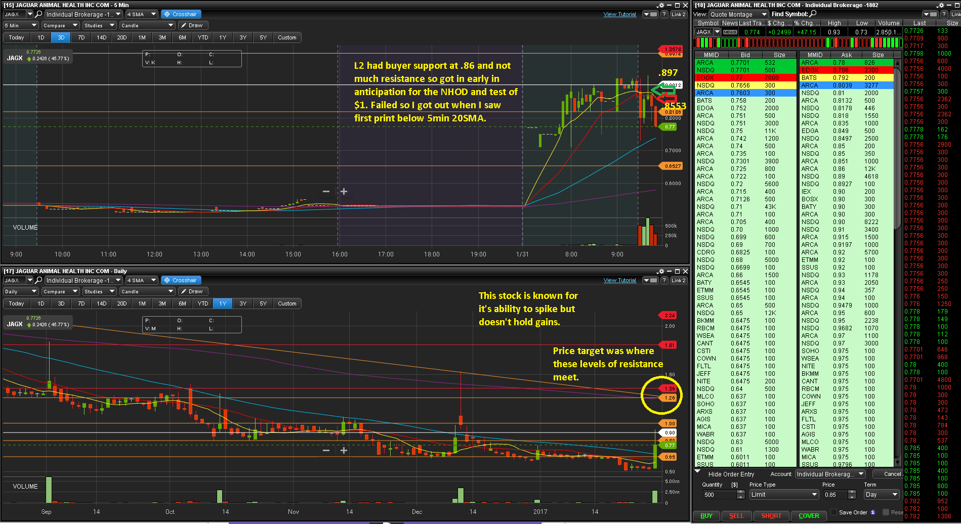 News of licensing deal. Was appraoching PM highs and L2 looked good. Placed order just before the break but executed a couple cents higher than expected. Failed and began to crack 5min 20SMA so got out when I saw the first print below .86. Used limit orders with room to breath and even though there were orders available, I got executed close to my limit. Not too worried about the sell order, I rather get out than get stuck but need to be more specific with orders when stock isn't moving fast.