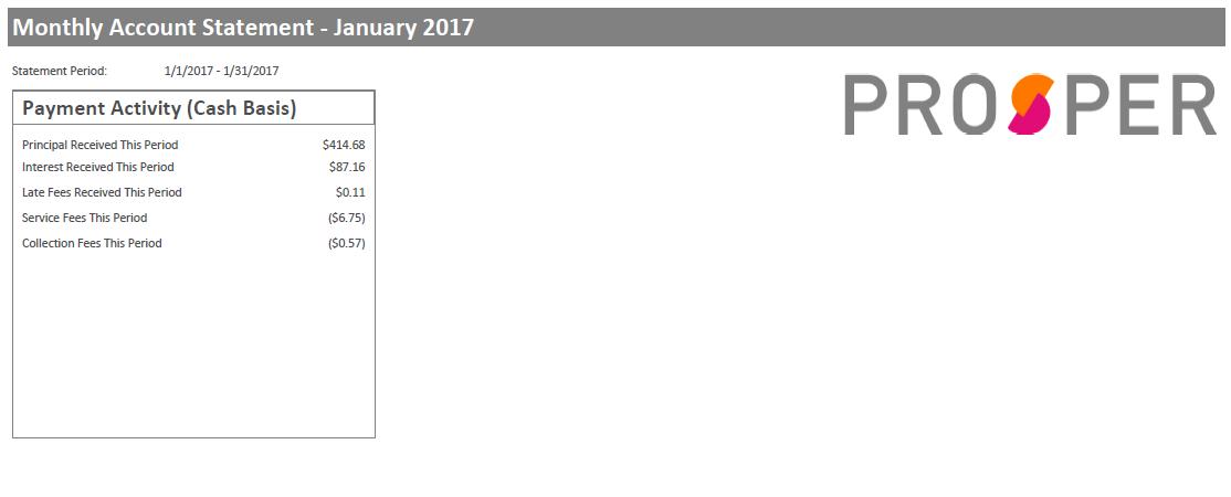 Prosper consumer (P2P) notes for Year 2017. Monthly PNL Interest for Jan 2017 = $87.16