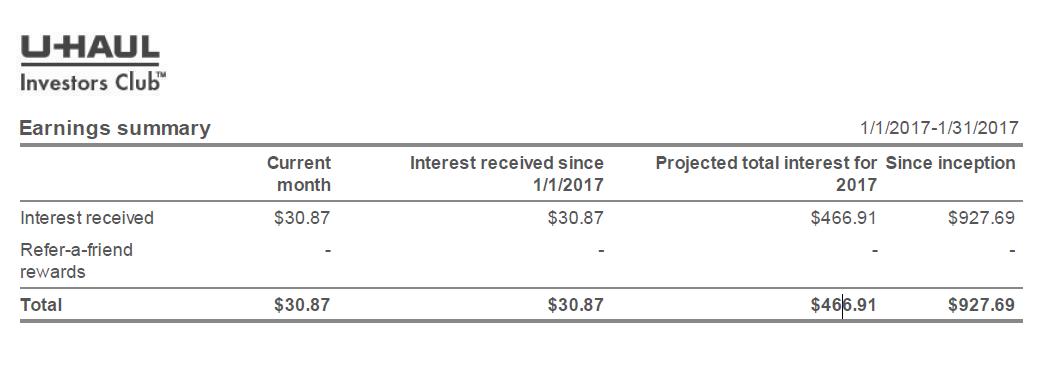 Uhaul Investors Club Notes Jan 2017. U-Notes are long term investments in AMERCO (UHaul) asset backed corporate notes. Monthly Interest P/L $30.87.