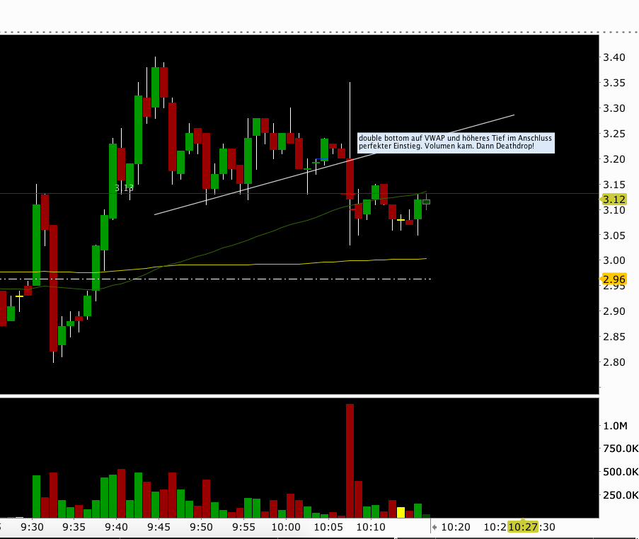 Entry comments: Nice double bottom after drop (Point B). Don't want to chase the stock because I noticed the irrationality of the market. Waited for a higher low and some volume. Exit comments: Looked pretty weak but suddenly massive volume stepped in and the stock jumped 15 Cents upwards. In the same candle somebody dropped all his shares and I got stopped out under VWAP. What was that? I need a strategy which is securer right now!