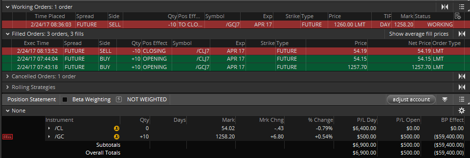 Profit of $6400.00 on a rare overnight trade. The chart indicators showed strength before going to bed. I added a trailing stop loss order to preserve profits while I was sleeping. It triggered and I woke to a nice profit. Added some gold contracts. Expect to sell those at $1260. The dollar weakened a bit today offering some good entries into gold. See you Monday God willing.