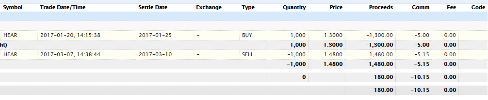 Entry Comments: Bought in my trading account for a potential spike due to volatility I had witnessed happened multiple times from a bounce off of $1.30. Turned out to be wrong initially but decided to hold till 4Q earnings release. | Exit Comments: With HEAR to release earnings tomorrow after the close, tons of shorts covered causing a massive rally. Took advantage and exited with modest +13.8%. Sometimes waiting around does pay off.