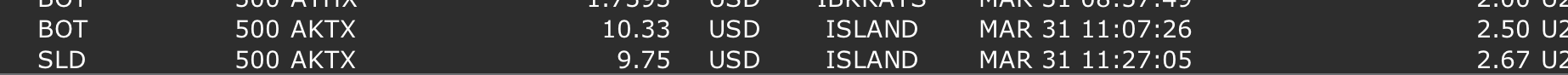 Was trying to play off a small dip in the trading range but looking at earlier in the day I realized that the previous spike showed the stock cooled off a fair bit before running again. Drawing a trend line may have helped with my entry point. I cut losses a little too late and made a fat finger mistake. Bad timing to be in the trade at work. The stock was still a good play on the day but my entry was at the wrong time. I have to remember to look at the days performance for some indicators.