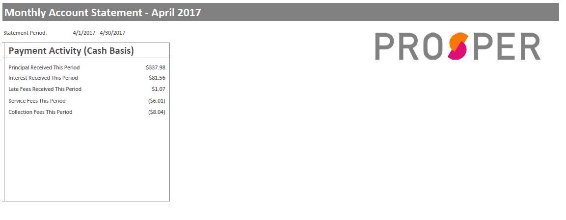 Prosper consumer (P2P) notes for Year 2017. Monthly PNL Interest for April 2017 = $81.56