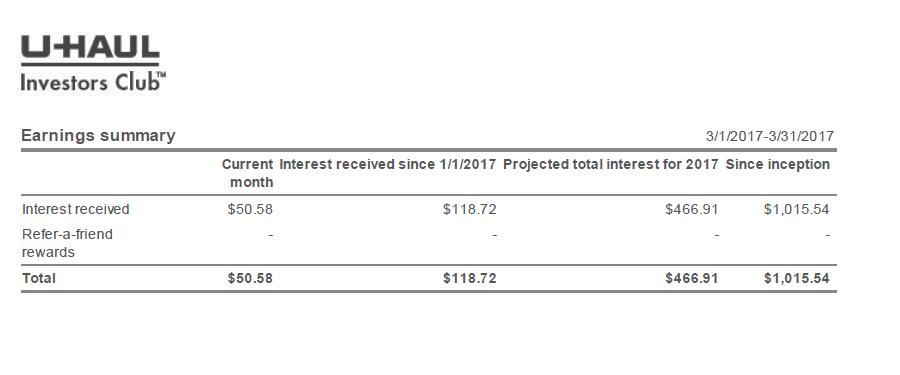 Uhaul Investors Club Notes March 2017. U-Notes are long term investments in AMERCO (UHaul) asset backed corporate notes. Monthly Interest P/L 50.58