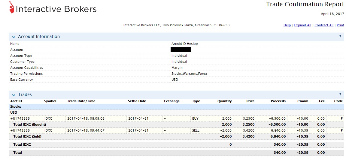 Happy with this trade albeit that it wasn't perfect and left plenty of money on the table. Long 2K IDXG @ 2.25 on news that United Health is going to cover IDXG's cancer test. Was confidant in the news but less than perfect entry @ 2.25 plus the fact that I needed to go catch a plane meant I took my profits prematurely. Exited @ 2.42 for a $340 profit. 10 minutes more patience would have been $1,600 more profitable and I would have still caught my plane. Thank-you Timothy Sykes and the market.
