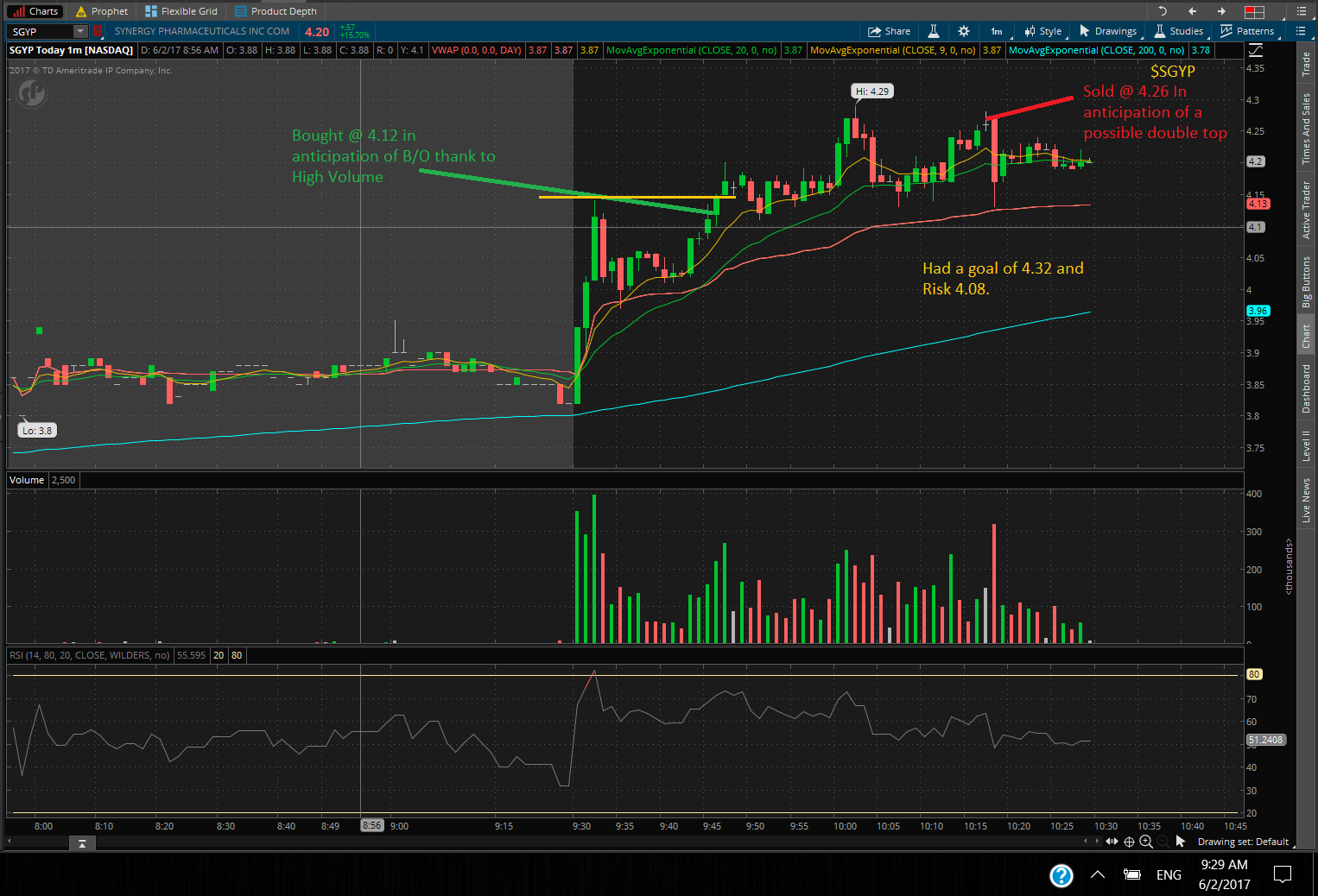 Got in at 4.12 out at 4.26. Anticipated a breakout. Planned the the trade, traded the plan. Aimed for .20-.30 cents a share with a risk of maximum of .04-.07 cents . Got out as big blocks of sellers were stacking, preventing this thing from going any further. Anticipated a double top and got out. Was proven correct as this is what it looks like now: