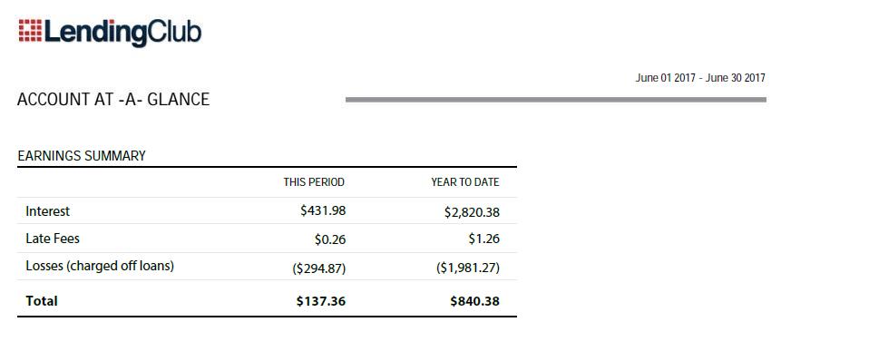 Lending Club notes. Monthly net interest for June 2017. Gross monthly PNL: $431.98 Late Fees $0.26 Charge-offs (borrowers who failed to pay) ($294.87) NET Monthly PNL $137.36.