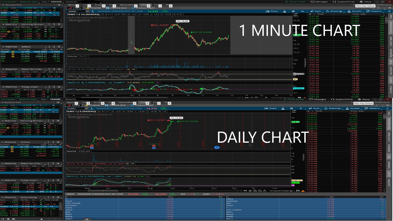 I shorted this $1 billion dollar biopharmaceutical company because the daily chart of the RSI was around 80 which means it was over-extended after several days of spiking, today is its most choppiest day since it ran up from the $10 to $15, and there were the huge wall of sellers at $15. So, that was the reason why I shorted this stock. I covered too soon again my goal was to make 5% on the down side but because this is $1 billion dollar company so I got scared LOL.
