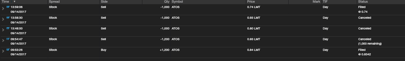 I was looking for a breakout. I bought 1200 in at $.84 cents. It came right back down and lingered in the mid to high 70s most of the day until a afternoon spike. It shot up to $.93 cents where i was trying to sell. Only sold 200 of my shares. Like a dummy, i waited to see if it would go back up, but instead i missed the second chance (the bounce) and ended up taking a loss at $.74 cents. Dummy.