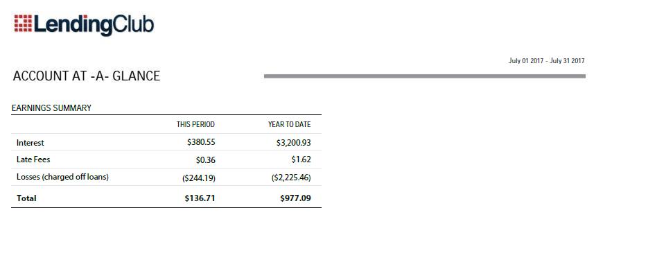 Lending Club notes. Monthly net interest for July 2017. Gross monthly PNL: $380.55 Late Fees $0.36 Charge-offs (borrowers who failed to pay) ($244.19) NET Monthly PNL $136.71.