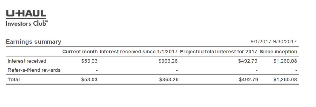 Uhaul Investors Club Notes September 2017. U-Notes are long term investments in AMERCO (UHaul) asset backed corporate notes. Monthly Interest P/L $53.03..