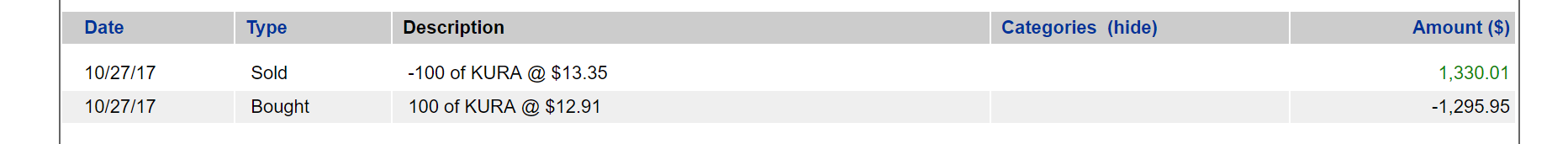 My favorite catalyst: cancer news. There was a quick spike and then rapid drop, stock halted. Sputtered on the restart, thought I was getting in on the low side @12.91, but was off by about 50 cents. Stuck with my hypothesis that cancer = good catalyst, watched it climb. Took a shower with limit sell of $14, got out and found it had hit 13.80+ (boo), decided to get out around 13.30 where it was settling in with fading volume.