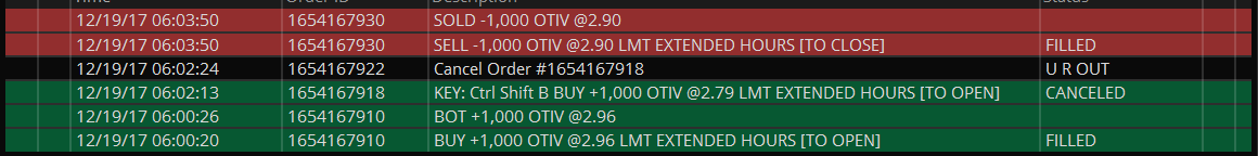 So close again. I wanted to get in for the 7am broker dip, but I was a bit too quick on my buy as the downside wasn't complete. I bought at $2.96 and the stock dropped down to $2.75. I tried to buy a second time but didn't get filled, so as the stock started to go back up to where I first bought, sold for a small loss since I missed the play. I needed to be just a bit more patient before I got in, but I thought the red bar was done since it went 3.18 -> 2.96 and I was playing 2.90 bottom.