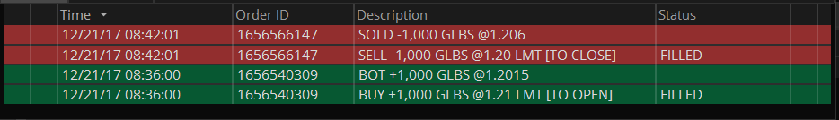 I'm happy with this trade, even though it didn't work out and was a commission loss. This stock hit a few of my alerts today as it started to curl into PM highs from 12/15. There was a big 45k+ bidder, so I got in at $1.20 on some early volume, feeling I had a safe exit point if it started to get sold into. Stock only moved up 2c before settling back to where I bought it, so I got out back where I got in since it didn't do what I wanted. Stock is now 3c under so I cut losses quickly.
