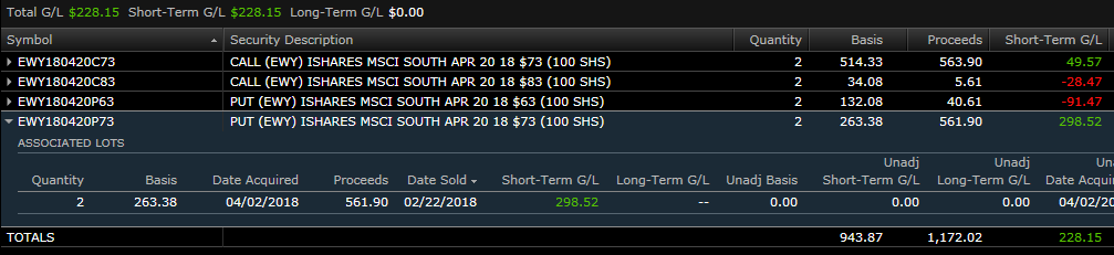 With today large down day, was able to take off some premium for 2 IB in April and 1 bear credit Sprd. for May. Got the 25-30% max profit target (gross of commissions) so took the trade off for a nice % & $ win. 4/2/18 Entered into a few more short strangles ( 2 EEM $41P/$50C & 1 SMH $88P/$113C) with May Expiration today as the spike in volatility hopefully will work by selling the near 15 delta strikes. IV rank were 96 for SMH & 82 for EEM.