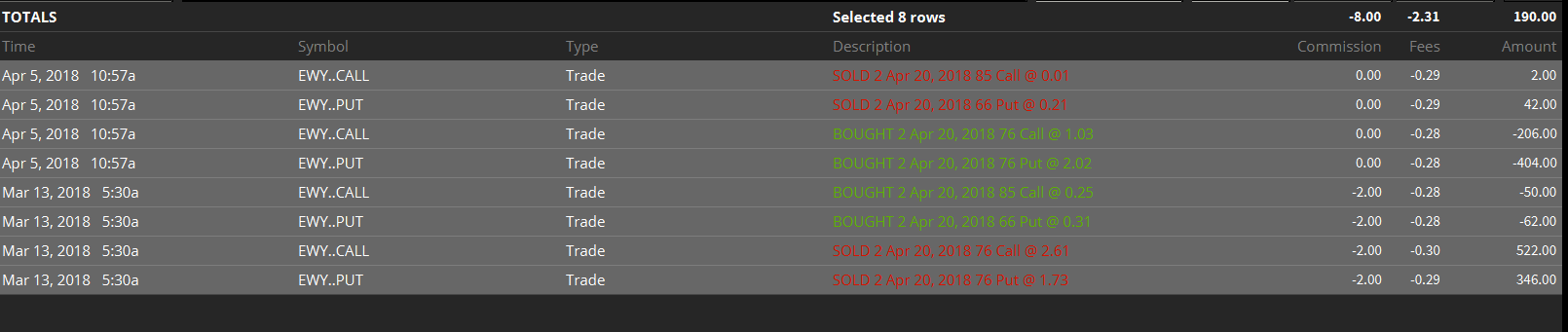 Closing out IB positions as they came into the profitable target range on the 3 day bounce this week and we are getting within 3 weeks away from April Expiration. Still have a few more laddered positions that are looking pretty good as Theta is working in our favor and the large selloff today (4/6) is working in our favor too. Tastyworks Account EWY APR 2018 IB 2 66 76 76 85