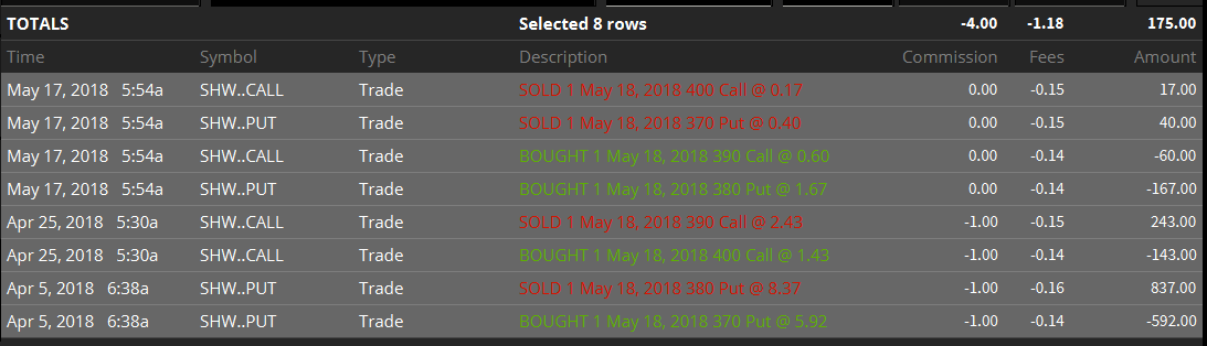 Original trade was a Put credit spread on 4/5, added the Call credit to create an IC on 4/25 after the stock had a decent selloff. Reduced risk by $100. Stock had a nice rebound the last week before expiration and hovering around the full profit window of $380-390. Hit my 50% target on Thurs. Closed right in the range on Friday, but happy with getting a profit as it could have easily went outside on the range and been a loss as well. SHW MAY 2018 PCS 1 370 380 390 400