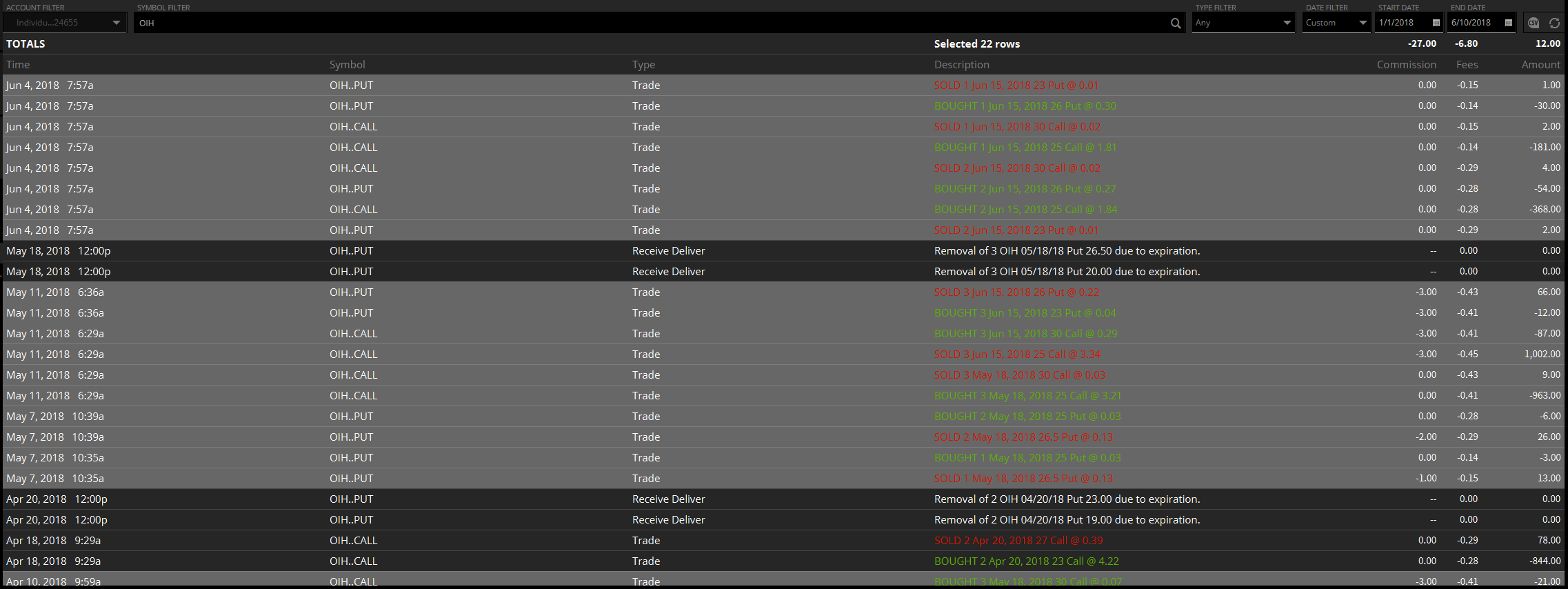 Opened in April and rolled from May to June then adjusted during this at least once maybe twice during thetrade cycle. Kept working it and got out for a scratch ($34 in commissions) but better than a $1K loss, which was where this position was sitting after the huge move up in OIH in a short period of time. Tastyworks Account - OIH JUN 2018 IB 3 23 26 25 30
