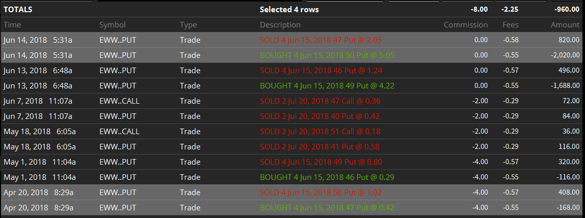 Got a little cocky with position size and going with a directional trade. I need to stick with neutral ones, that I've had much better luck with as well as ones with much higher IVr or really low if buying options. This is #1 of 2 that got crushed. Keep grinding and laddering into high probability trades. TW Account - EWW JUN 2018 PCS 4 46 49