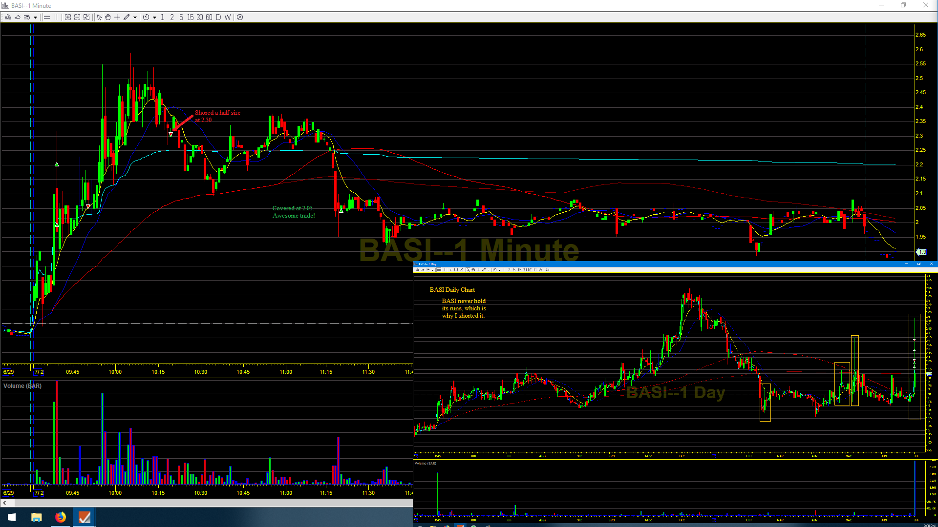BASI. When you can't get the long right. NAIL the short. Shorted a half size on the early formation of resistance of the 9ema. Got in at 2.30. Covered at 2.05. Had to go through some "uptrend" attempts to get this profit and I honestly should've sized in more at 2.35 but my small size allowed me to focus and not worry so much about gains and losses but more on the trade itself. The plan was that this would fail just like all previous runs on the long term chart.