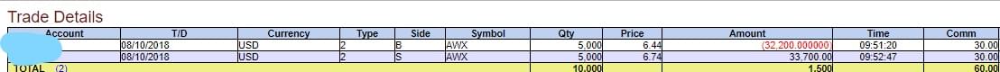 I saw AWX up on earnings in A/M so i put it on my watchlist for the morning. It gapped up in the morning and i wanted to jump in on the morning spike but i dont want to get into that habit because its a good way to get burned. I ended up waiting almost 30 minutes for my pattern to form but when it did i played immediately. I figured the chart was close to the top so i took what it gave me. It definitely was the riskiest trade ive made since i played MTUU.