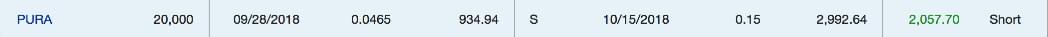 I was long on PURA. Starting my position on an up-trading chart after a PR (that for once Tim S. didn't see), I stayed long after multiple PR and multiple days with high volumes. I wanted the price to be higher than 0.1. Last week, almost reach 0.15 (0.1495) but the following days, in conjunction with the decrease of the Dow Jones, it fell. I put a limit order at 0.15 and it went through today (I took the profit there even if I could have been greedier). Very happy of this trade.
