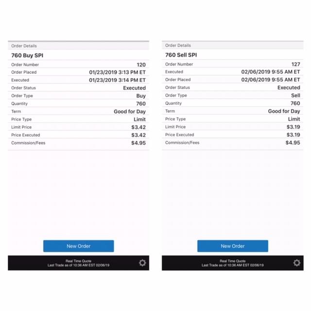 In @ $3.42 and out @ $3.19. Another losing position that I failed to cut losses quickly and decided to hold. Fortunately, the price came back and even went above my entry point. The other mistake I made was I didn't protect my profits once I finally had a profitable position. The price started to drop quickly and I ended up getting out much lower than I had wanted.