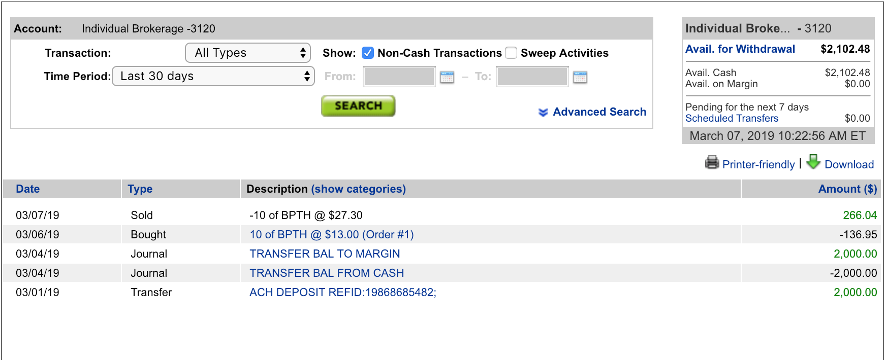 BPTH up on positive news from Phase II clinical trials. In 10 shares at $13 at 11:57 AM PST (3/6). Held overnight. Out the next day (3/7) at $27.30 at 6:47 AM PST. For my first trade with real money, I have no complaints whatsoever with a 110% return. I've been training for this moment for 6 months. Thanks Tim!!!
