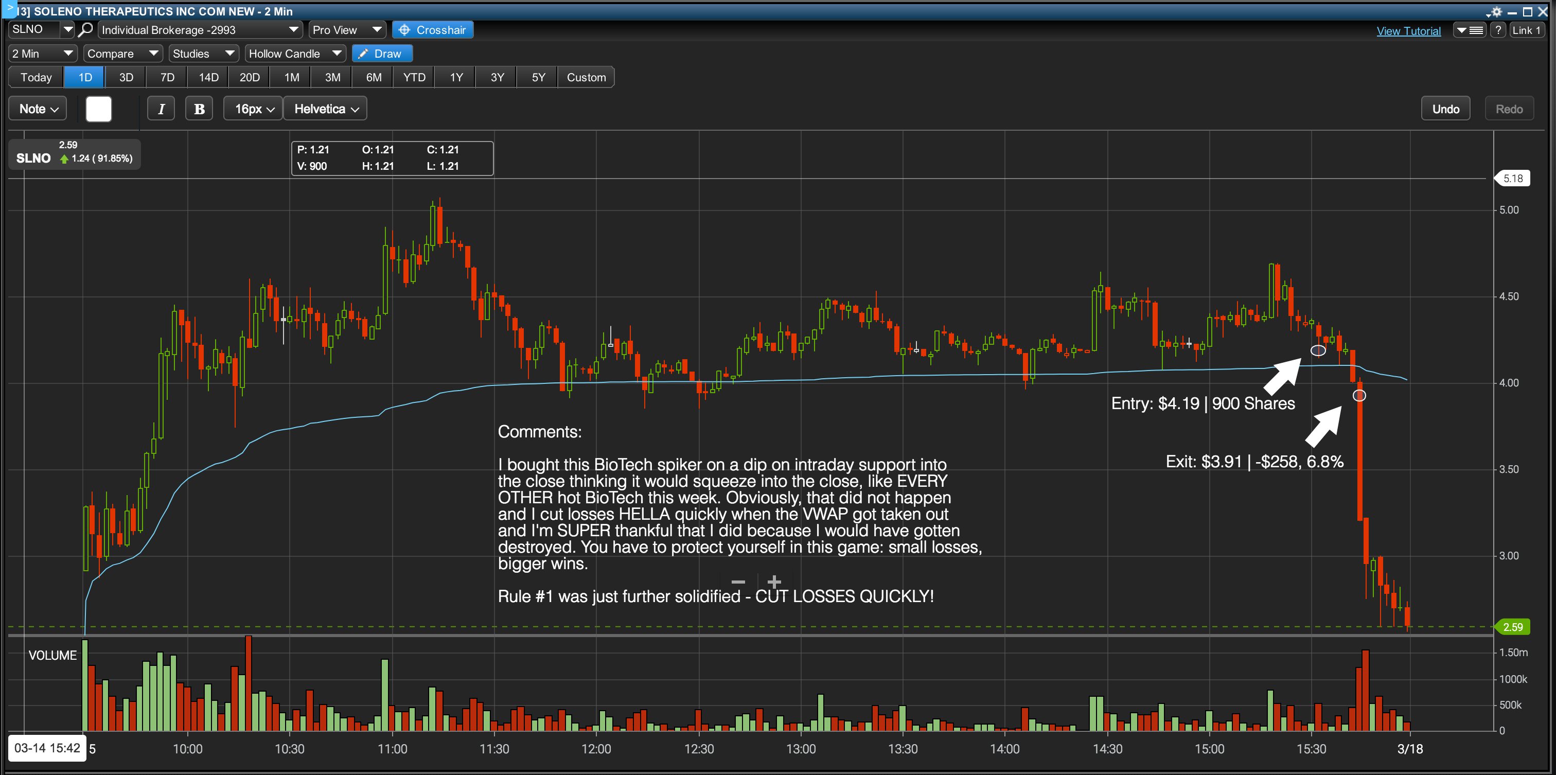 I dip bought this 1st green day hot bio-tech at the end of the day with the goal of selling into a short squeeze into the close. Bio-techs are running hard this week and all of them have been squeezing into the close. I ended up cutting my losses quickly, thank God, because the stock tanked into the close. It's been a while since I've seen an afternoon panic like this one. You have to protect yourself - cut losses quickly!
