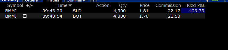 Been stalking this this for a week now. I saw it going red and watched level 2 for a decent entry to a panic dip buy. wanted to fill 8000 shares but only got what i got. Sold way too soon but it was at my goals so i took it off. Next time i will be more patient i hope. BMMJ is now breaking out past the day highs and bouncing wow!!!